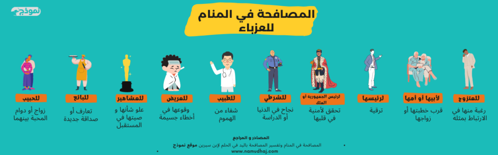 • مصافحة العزباء للشيخ في المنام تدين، و مصافحة المرأة العجوز الغريبة تدهور في أمور المال أو العمل.